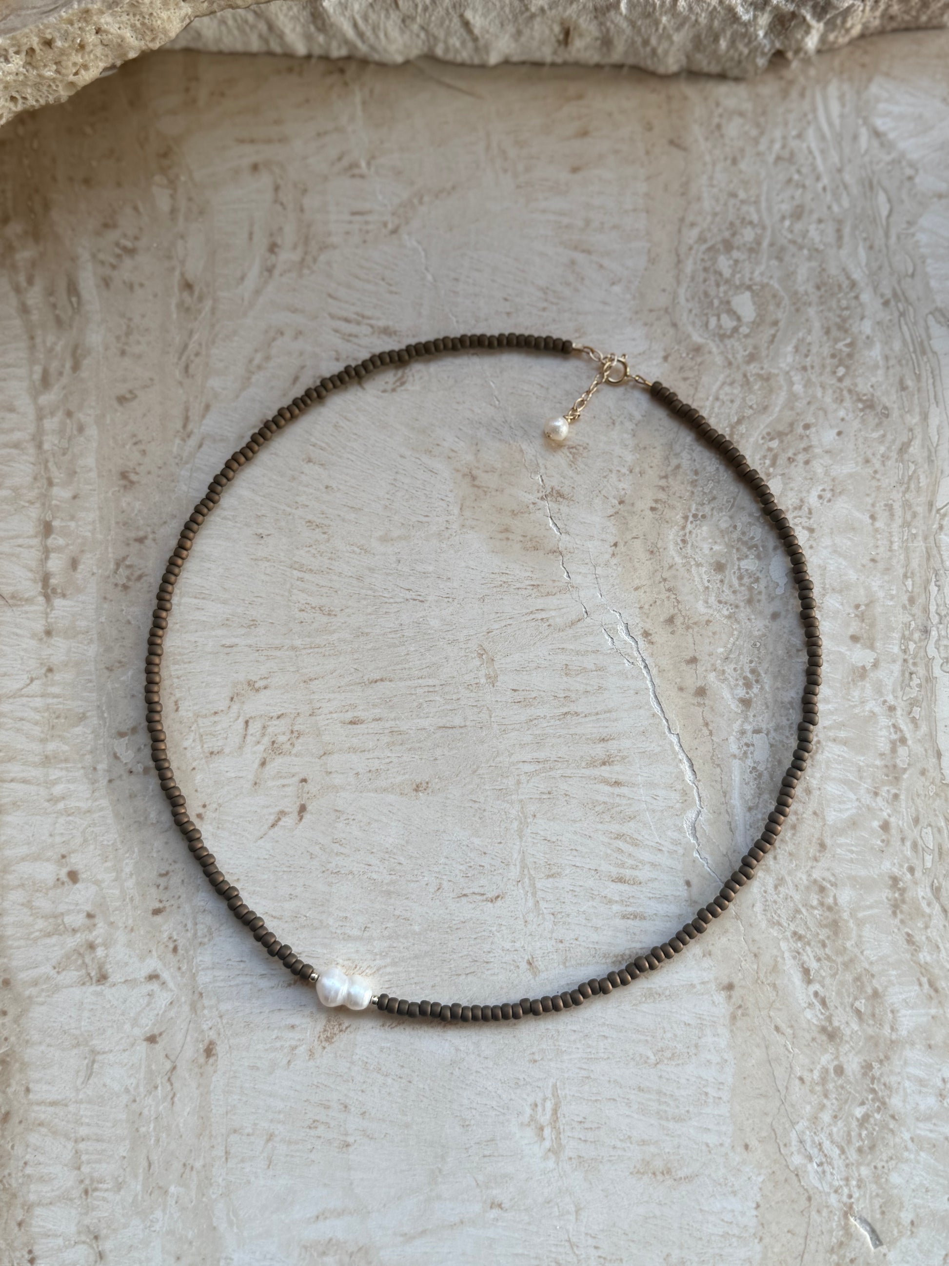 - 3mm seed beads with two 14k gold-filled beads on either side of a 4-5mm Freshwater Pearl